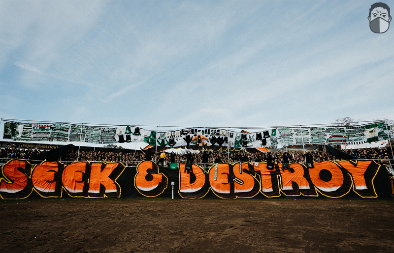 Nach der mehrheitlich überzeugenden Vorstellung letzte Woche dürfen wir euch heute schon wieder zum Derby willkommen heißen. Alles also auf Anfang, es ist wieder Sonntag, Bullen rotieren im Viereck, die Pferde scheißen den Park voll, der Sensocopter steht über dem und wir sind hier um unserem Verein und unsere Farben zu präsentieren. Wobei: das mit den Farben stimmt heute nur so halb, aber das sehr ihr ja bereits. Schwarz ist das neue bunt. Laute Rockmusik aus knarzigen Boxen, schmutzige Böden, Sex, Drugs und verschwitzte, langhaarige Typen mit Alkoholfahne in noch nie gewaschenen Jeanskutten mit Senfflecken – all das gibt‘s auch heute hier. Naja, vielleicht kein‘ Sex.